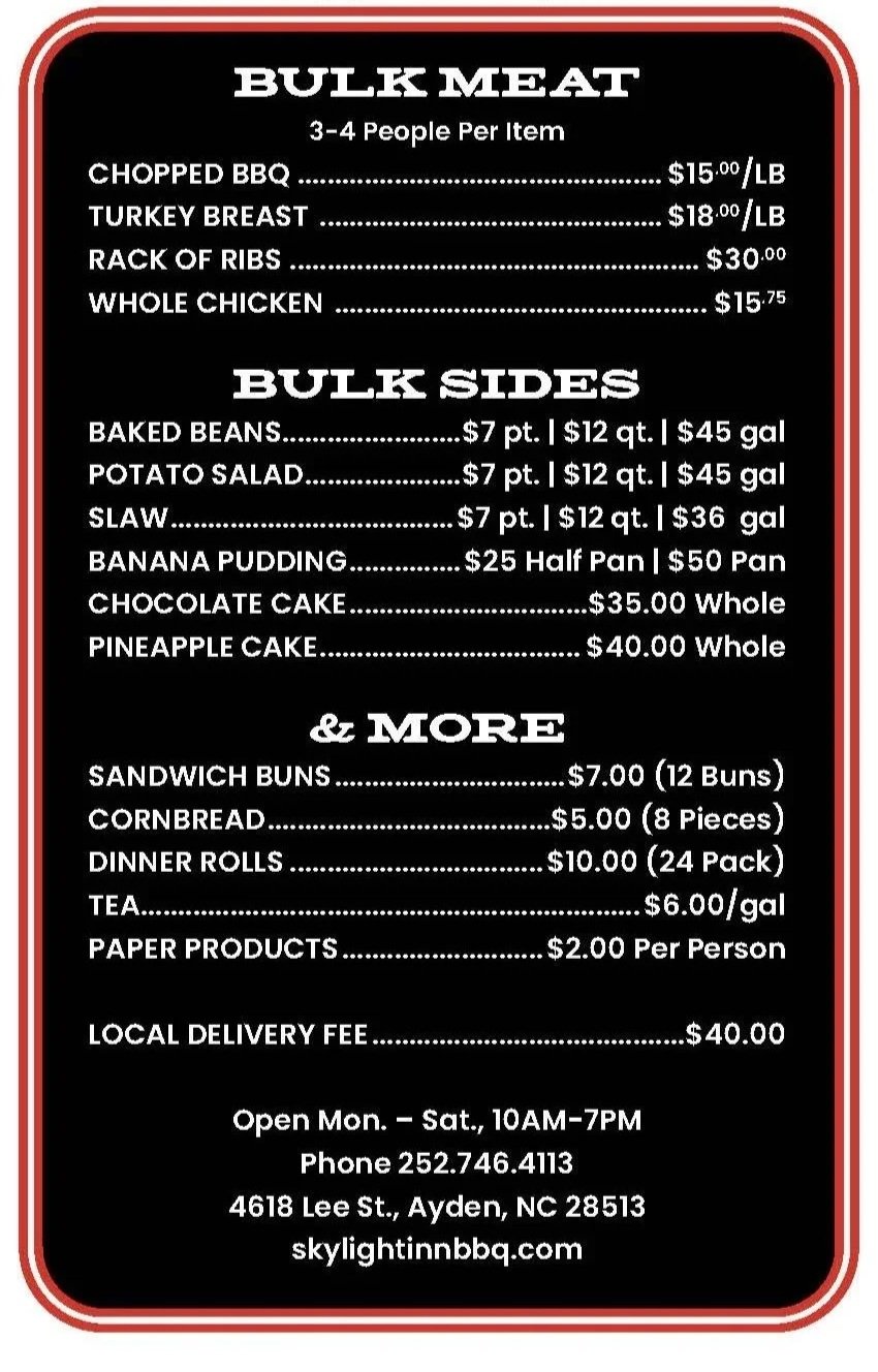 From company lunches and large family dinners to reunions and community events, Skylight Inn can help you cater any event - in a snap!